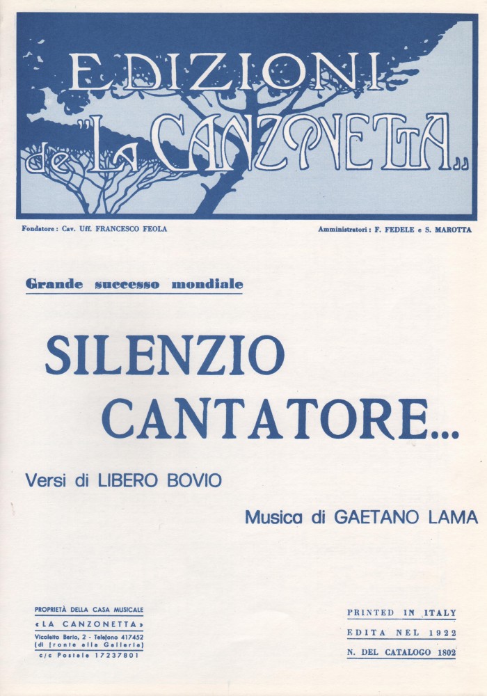 Silenzio cantatore (Versi di Libero Bovio - Musica di Gaetano Lama). Spartito musicale di Canto & Piano edito dalla casa editrice "La Canzonetta" nel 1922.