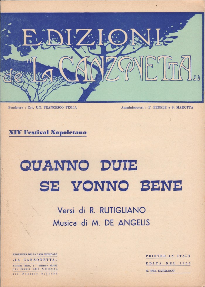 Quanno dduie se vonno bene (Versi di Renato Rutigliano - Musica di Mario De Angelis). Spartito musicale di Canto & Piano edito dalla casa editrice "La Canzonetta" nel 1966.