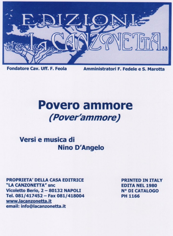 Pover'ammore - Povero ammore (Versi e musica di Nino D'Angelo). Spartito musicale di Canto & Piano edito dalla casa editrice "La Canzonetta" nel 1980. Un successo di Carmelo Zappulla. Colonna sonora del film "Pover'ammore" con Carmelo Zappulla, Lina Polito, Rosa Fumetto