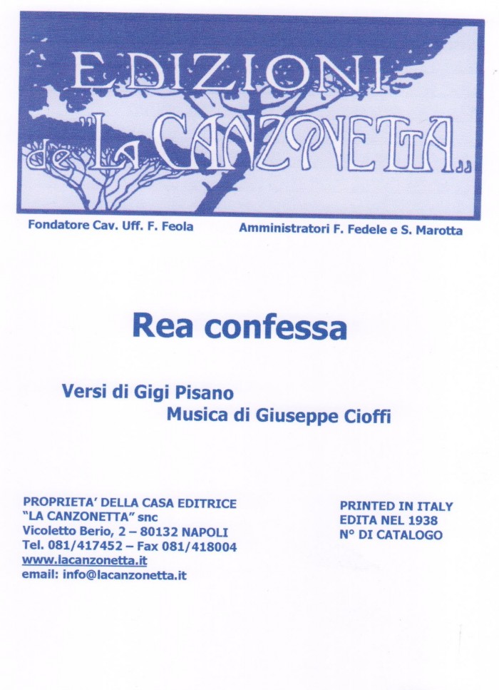 Rea confessa (Versi di Gigi Pisano - Musica di Giuseppe Cioffi). Spartito musicale di Canto & Piano edito dalla casa editrice "La Canzonetta" nel 1938.