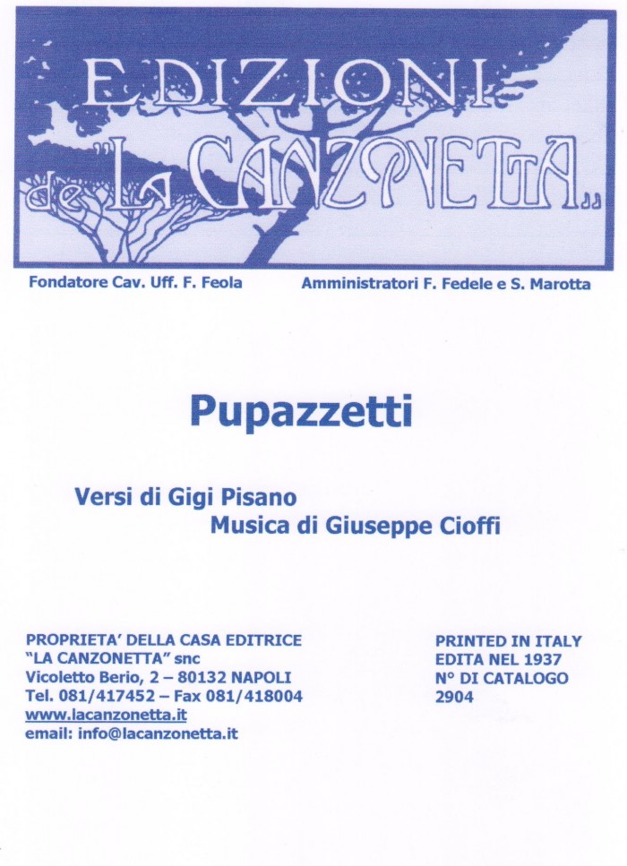 Pupazzetti (Versi di Gigi Pisano - Musica di Giuseppe Cioffi). Spartito musicale di Canto & Piano edito dalla casa editrice "La Canzonetta" nel 1937.