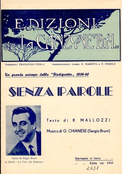 Senza parole (Versi di Raffaele Mallozzi - Musica di Guglielmo Chianese - Sergio Bruni). Spartito musicale di Canto & Piano edito dalla casa editrice "La Canzonetta" nel 1959.