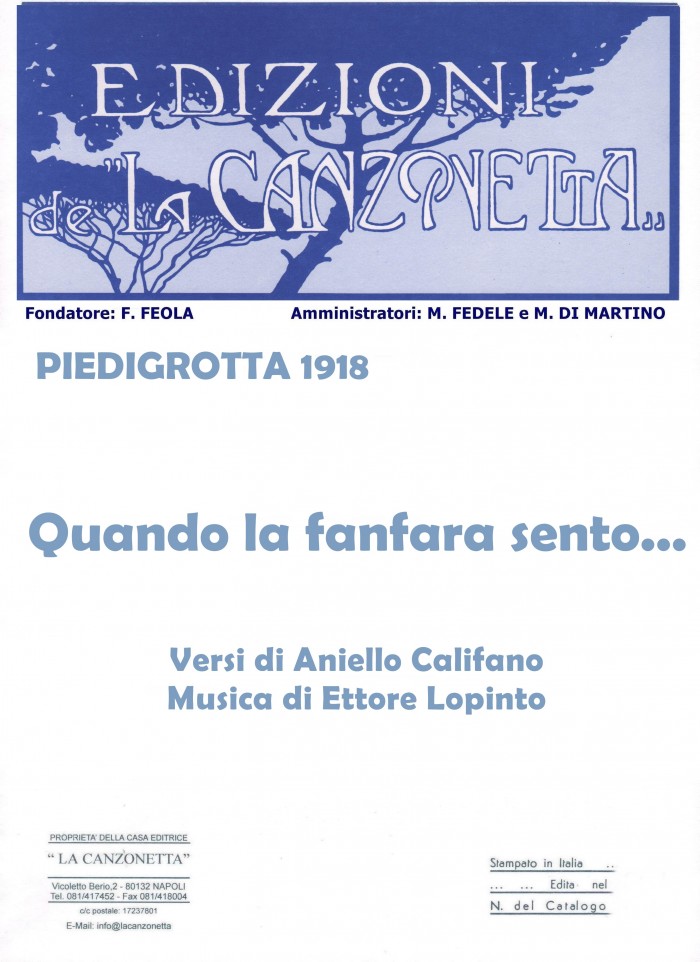 Quando la fanfara sento... (Versi di Aniello Califano - Musica di Ettore Lopinto). Spartito musicale di Canto & Piano edito dalla casa editrice "La Canzonetta" nel 1918.