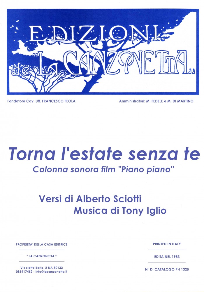 Torna l'estate senza te (Versi di Alberto Sciotti - Musica di Tony Iglio). Spartito musicale di Canto & Piano edito dalla casa editrice "La Canzonetta" nel 1983. Colonna Sonora Film "Piano piano".