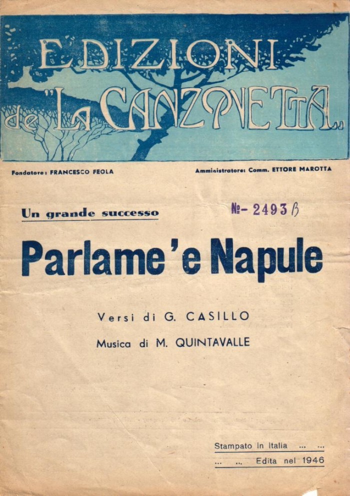Parlame 'e Napule (Versi di Giuseppe Casillo - Musica di Manfredo Quintavalle). Spartito musicale di Canto & Piano edito dalla casa editrice "La Canzonetta" nel 1946.