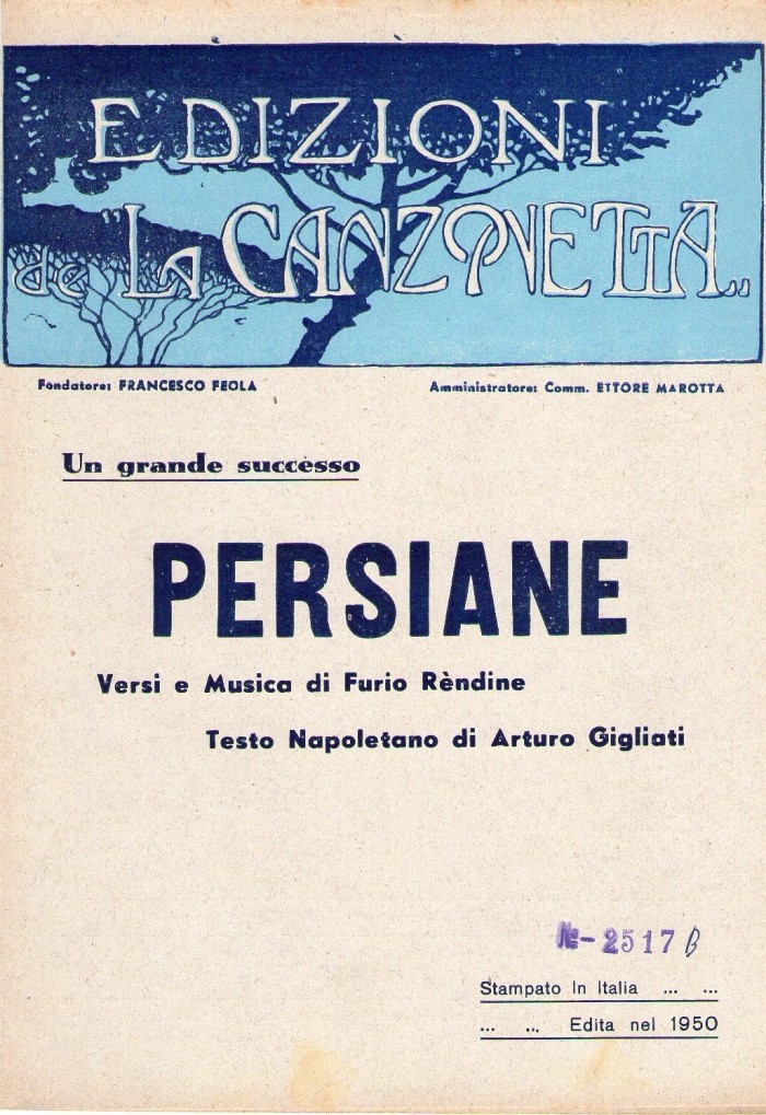 Persiane (Versi di Arturo Gigliati - Musica di Furio Rendine). Spartito musicale di Canto & Piano edito dalla casa editrice "La Canzonetta" nel 1950.