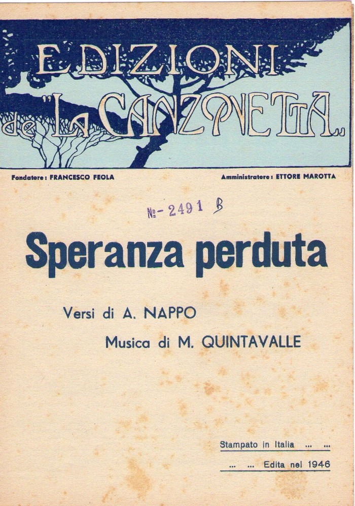 Speranza perduta (Versi di Agostino Nappo - Musica di Manfredo Quintavalle). Spartito musicale di Canto & Piano edito dalla casa editrice "La Canzonetta" nel 1946.