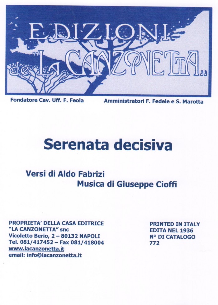 Serenata decisiva (Versi di Aldo Fabrizi - Musica di Giuseppe Cioffi). Spartito musicale di Canto & Piano edito dalla casa editrice "La Canzonetta" nel 1936.