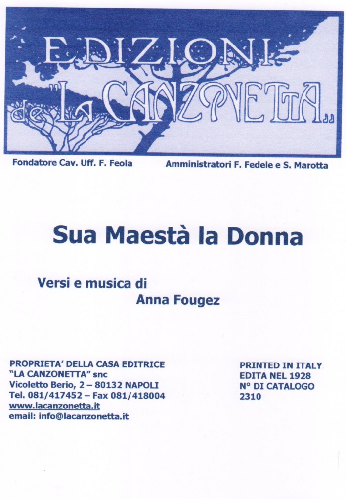 Sua Maestà la Donna (Versi e musica di Anna Fougez). Spartito musicale di Canto & Piano edito dalla casa editrice "La Canzonetta" nel 1928.