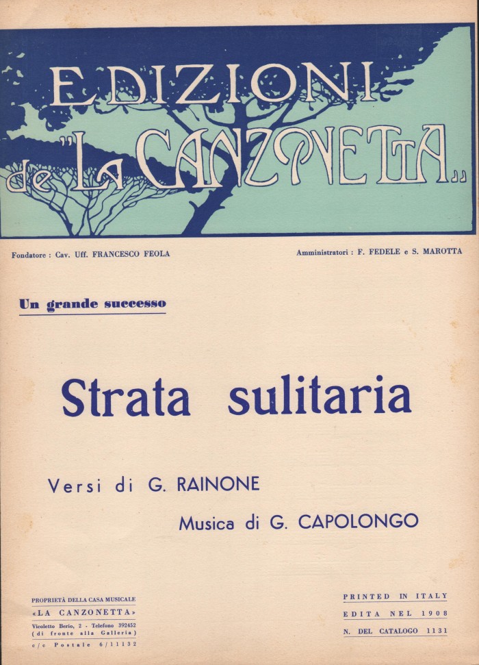 Strata sulitaria (Versi di Gennaro Rainone - Musica di Giuseppe Capolongo). Spartito musicale di Canto & Piano edito dalla casa editrice "La Canzonetta" nel 1908.