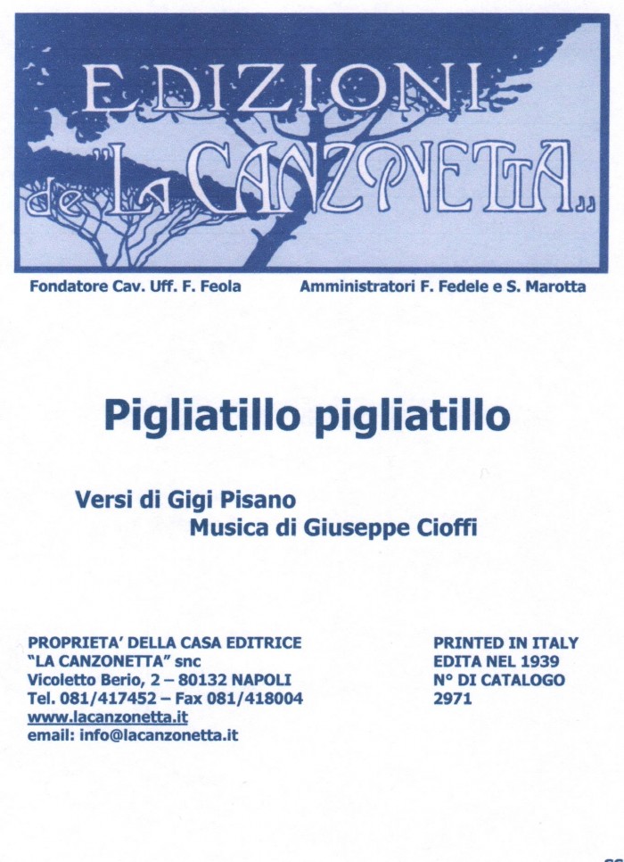 Pigliatillo pigliatillo (Versi di Gigi Pisano - Musica di Giuseppe Cioffi). Spartito musicale di Canto & Piano edito dalla casa editrice "La Canzonetta" nel 1939.
