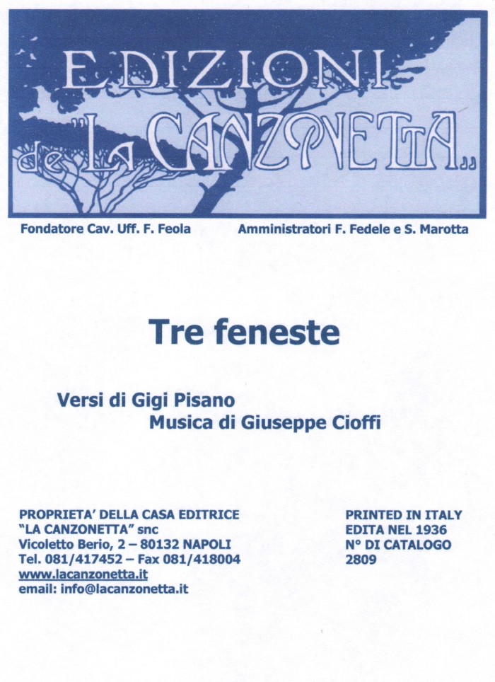 Tre feneste (Versi di Gigi Pisano - Musica di Giuseppe Cioffi). Spartito musicale di Canto & Piano edito dalla casa editrice "La Canzonetta" nel 1936.
