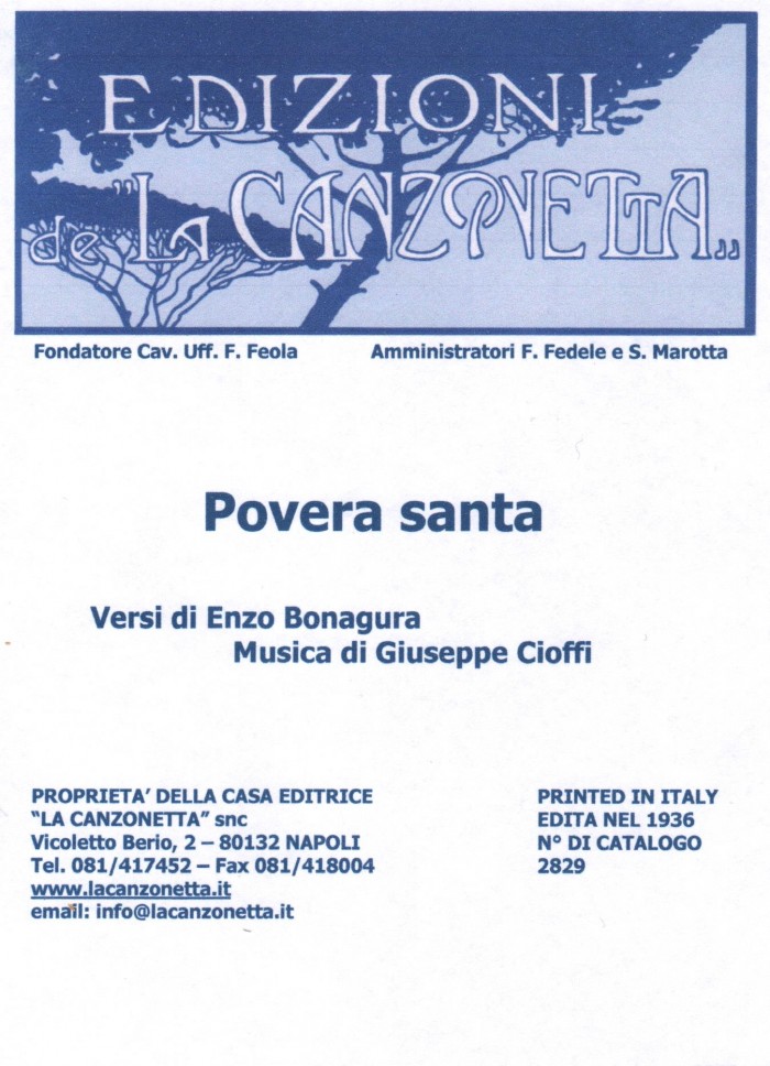 Povera santa (Versi di Enzo Bonagura - Musica di Giuseppe Cioffi). Spartito musicale di Canto & Piano edito dalla casa editrice "La Canzonetta" nel 1936.