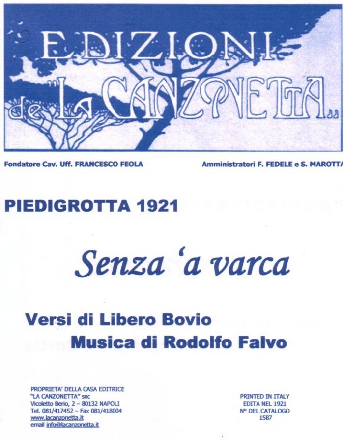 Senza 'a varca (Versi di Libero Bovio - Musica di Rodolfo Falvo). Spartito musicale di Canto & Piano edito dalla casa editrice "La Canzonetta" nel 1921.