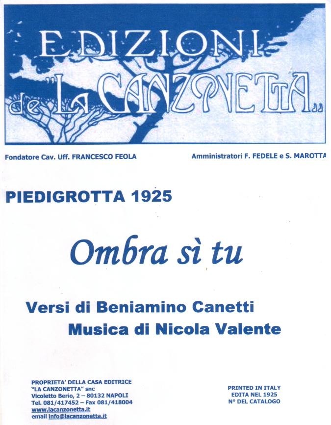 Ombra sì tu (Versi di Beniamino Canetti - Musica di Nicola Valente). Spartito musicale di Canto & Piano edito dalla casa editrice "La Canzonetta" nel 1925.