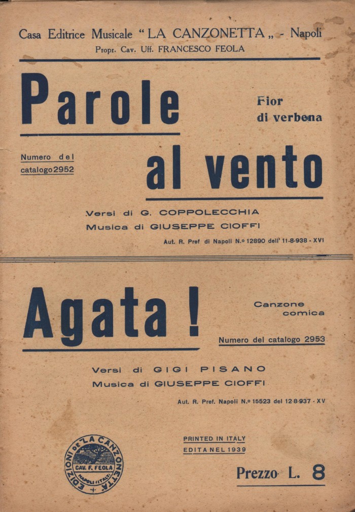 Parole al vento (Versi di Giuseppe Coppolecchia - Musica di Giuseppe Cioffi). Spartito musicale di Canto & Piano edito dalla casa editrice "La Canzonetta" nel 1938.