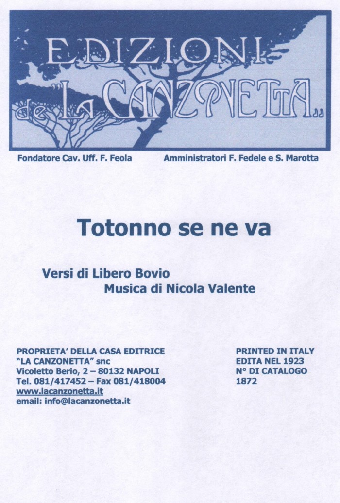 Totonno se ne va (Versi di Libero Bovio - Musica di Nicola Valente). Spartito musicale di Canto & Piano edito dalla casa editrice "La Canzonetta" nel 1923.