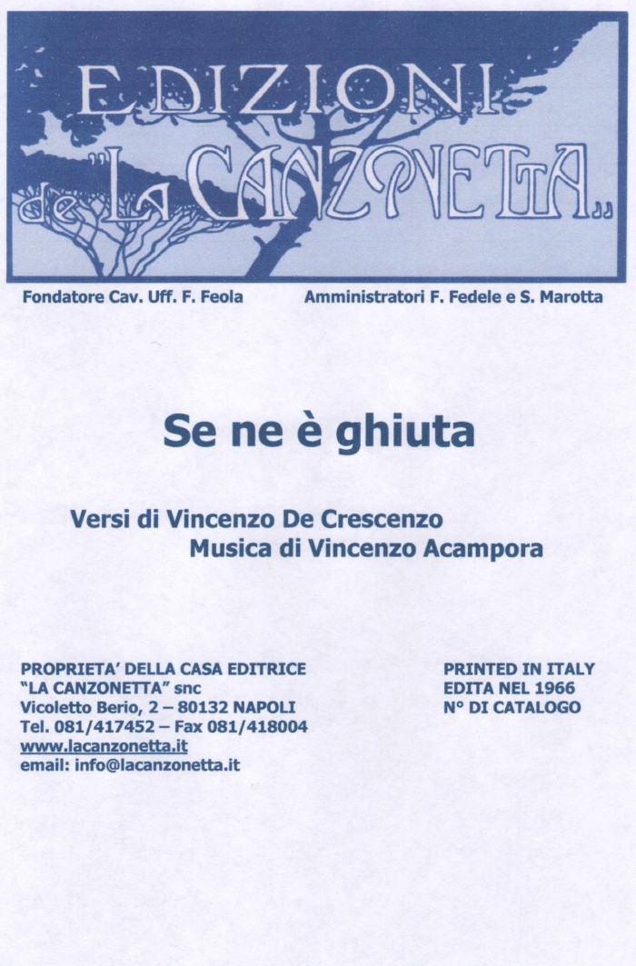 Se ne e' ghiuta (Versi di Vincenzo De Crescenzo - Musica di Vincenzo Acampora). Spartito musicale di Canto & Piano edito dalla casa editrice "La Canzonetta" nel 1966.
