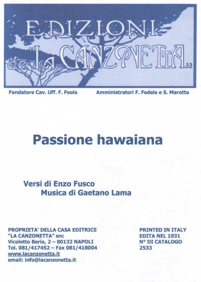Passione hawaiana (Versi di Enzo Fusco - Musica di Gaetano Lama). Spartito musicale di Canto & Piano edito dalla casa editrice "La Canzonetta" nel 1931.