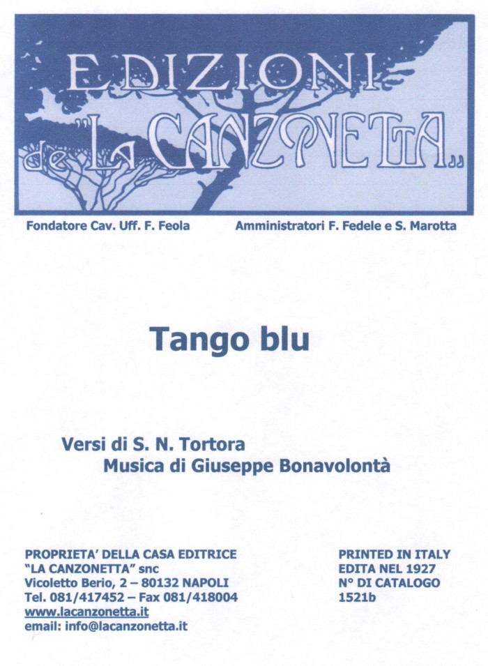Tango blu (Versi di S. N. Tortora - Musica di Giuseppe Bonavolontà). Spartito musicale di Canto & Piano edito dalla casa editrice "La Canzonetta" nel 1927.