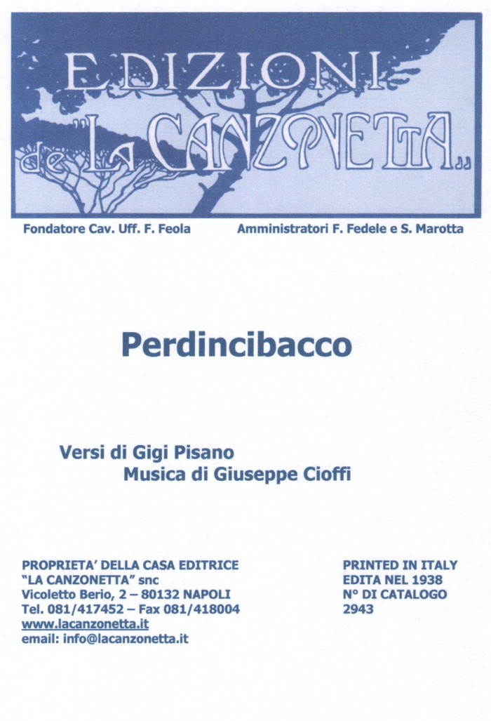 Perdincibacco (Versi di Gigi Pisano - Musica di Giuseppe Cioffi). Spartito musicale di Canto & Piano edito dalla casa editrice "La Canzonetta" nel 1938.