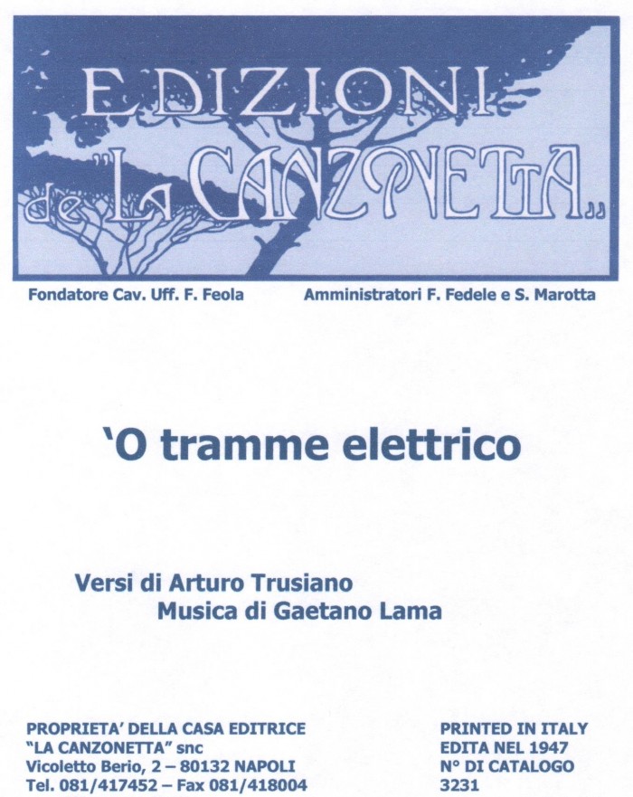 'O tramme elettrico (Versi di Arturo Trusiano - Musica di Gaetano Lama). Spartito musicale di Canto & Piano edito dalla casa editrice "La Canzonetta" nel 1947.
