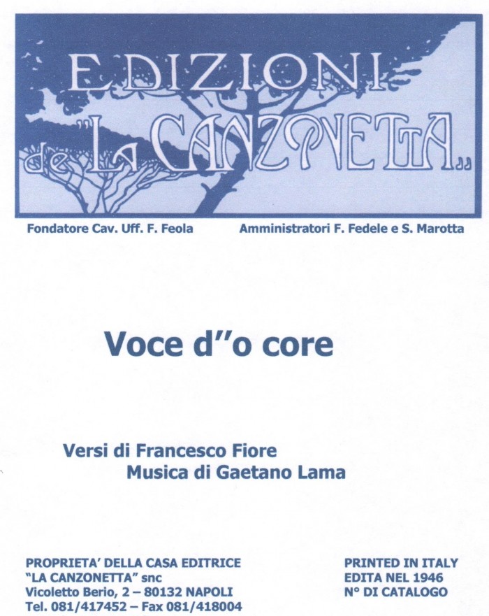 Voce d''o core (Versi di Francesco Fiore - Musica di Gaetano Lama). Spartito musicale di Canto & Piano edito dalla casa editrice "La Canzonetta" nel 1946.