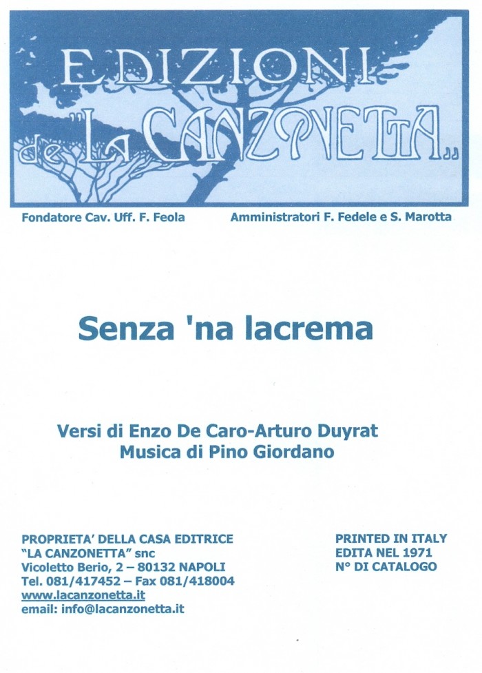 Senza 'na lacrema (Versi di Enzo De Caro-Arturo Duyrat - Musica di Pino Giordano). Spartito musicale di Canto & Piano edito dalla casa editrice "La Canzonetta" nel 1971.