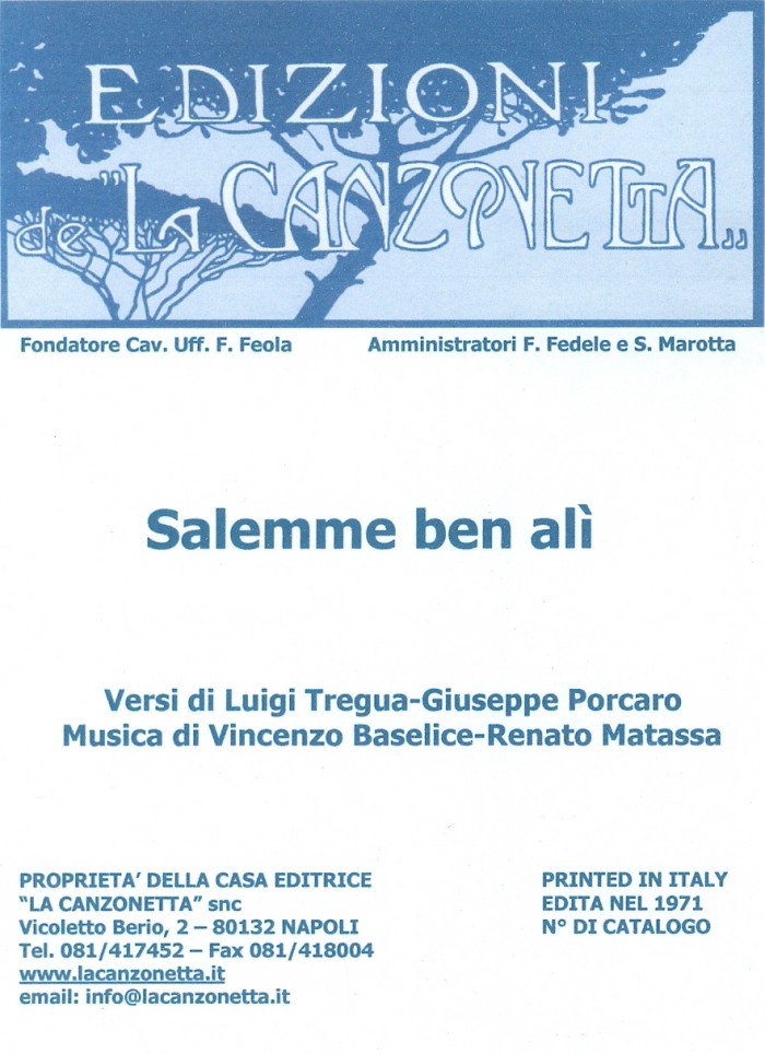 Salemme ben alì (Versi di Luigi Tregua-Giuseppe Porcaro - Musica di Vincenzo Baselice-Renato Matassa). Spartito musicale di Canto & Piano edito dalla casa editrice "La Canzonetta" nel 1971.