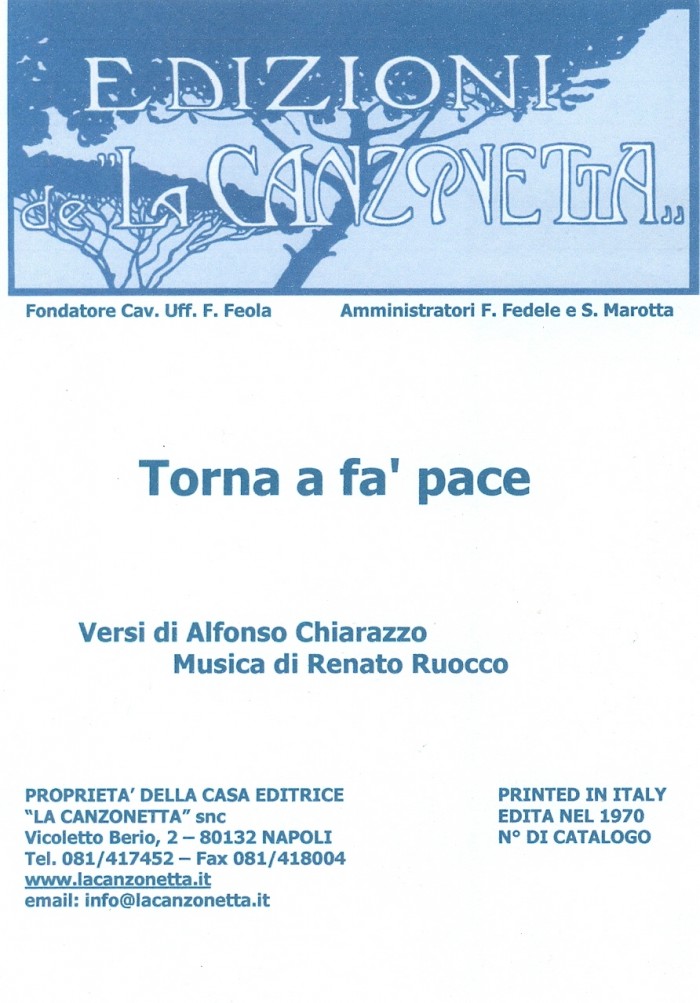 Torna a fa' pace (Versi di Alfonso Chiarazzo - Musica di Renato Ruocco). Spartito musicale di Canto & Piano edito dalla casa editrice "La Canzonetta" nel 1970.