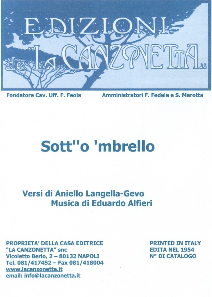 Sott''o 'mbrello (Versi di Aniello Langella-Gevo - Musica di Eduardo Alfieri). Spartito musicale di Canto & Piano edito dalla casa editrice "La Canzonetta" nel 1954.