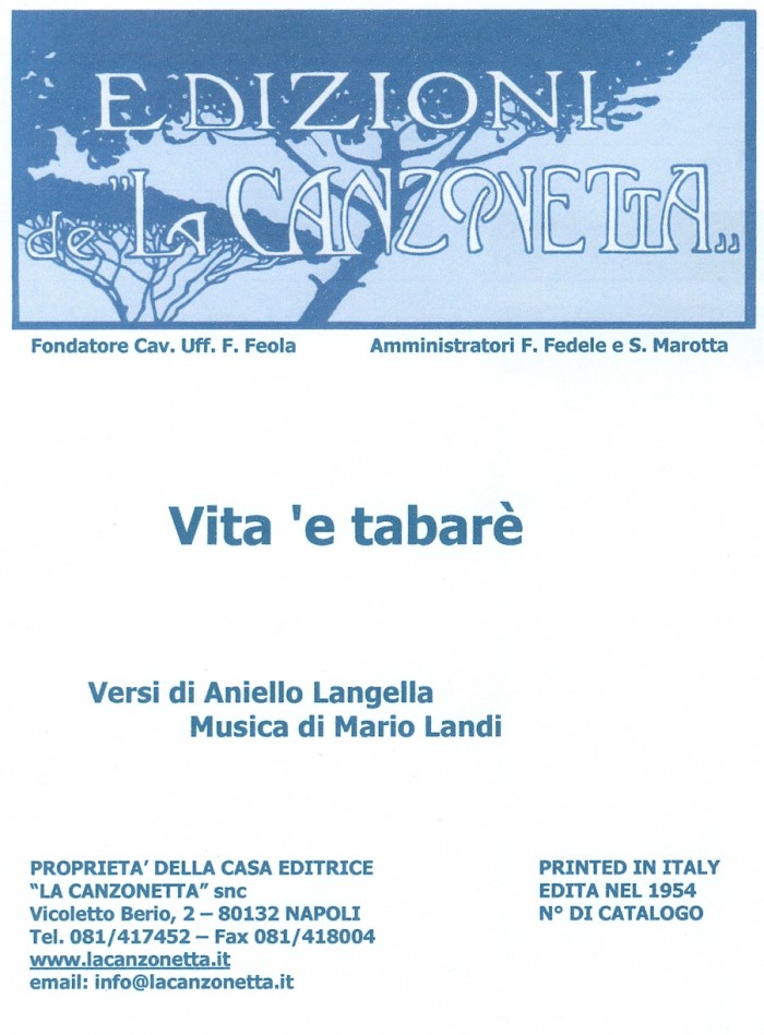 Vita 'e tabarè (Versi di Aniello Langella - Musica di Mario Landi). Spartito musicale di Canto & Piano edito dalla casa editrice "La Canzonetta" nel 1954.