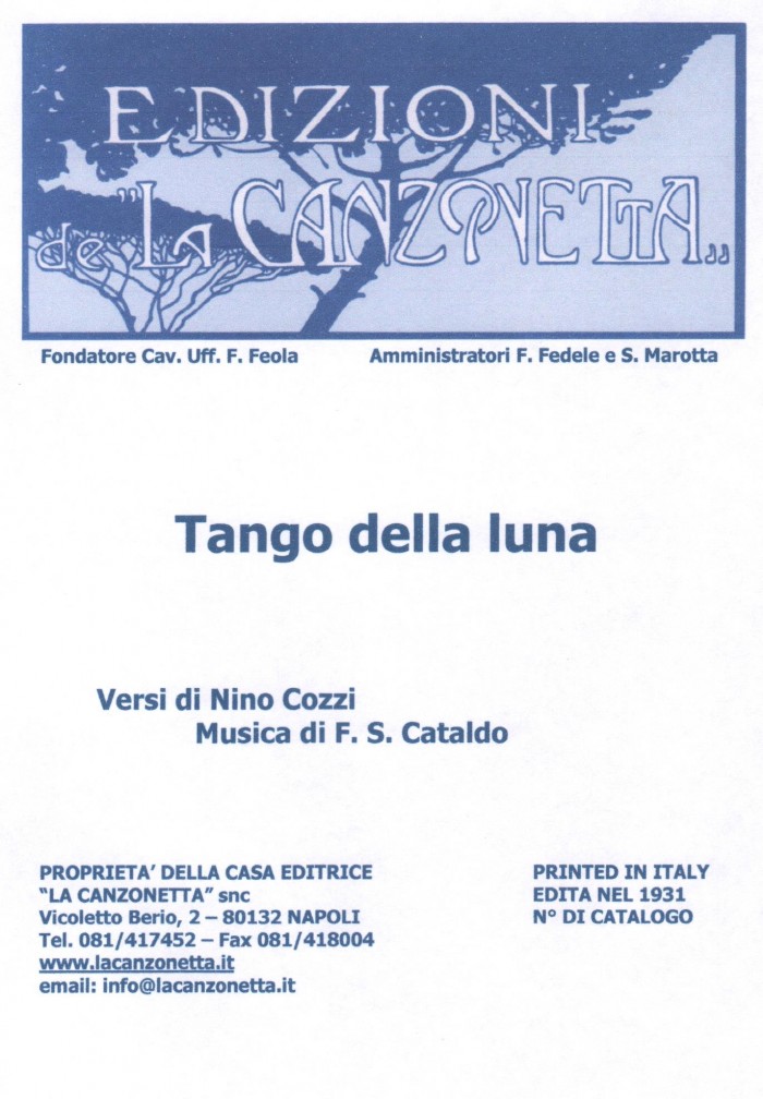 Tango della luna (Versi di Nino Cozzi - Musica di F. S. Cataldo). Spartito musicale di Canto & Piano edito dalla casa editrice "La Canzonetta" nel 1928.