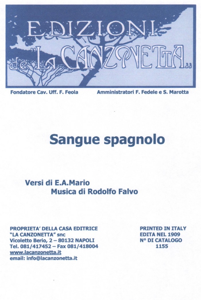 Sangue spagnolo (Versi di E.A.Mario - Musica di Rodolfo Falvo). Spartito musicale di Canto & Piano edito dalla casa editrice "La Canzonetta" nel 1909.