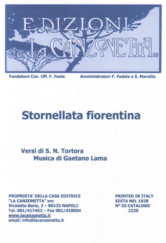 Stornellata fiorentina (Versi di S. N. Tortora - Musica di Gaetano Lama). Spartito musicale di Canto & Piano edito dalla casa editrice "La Canzonetta" nel 1928.