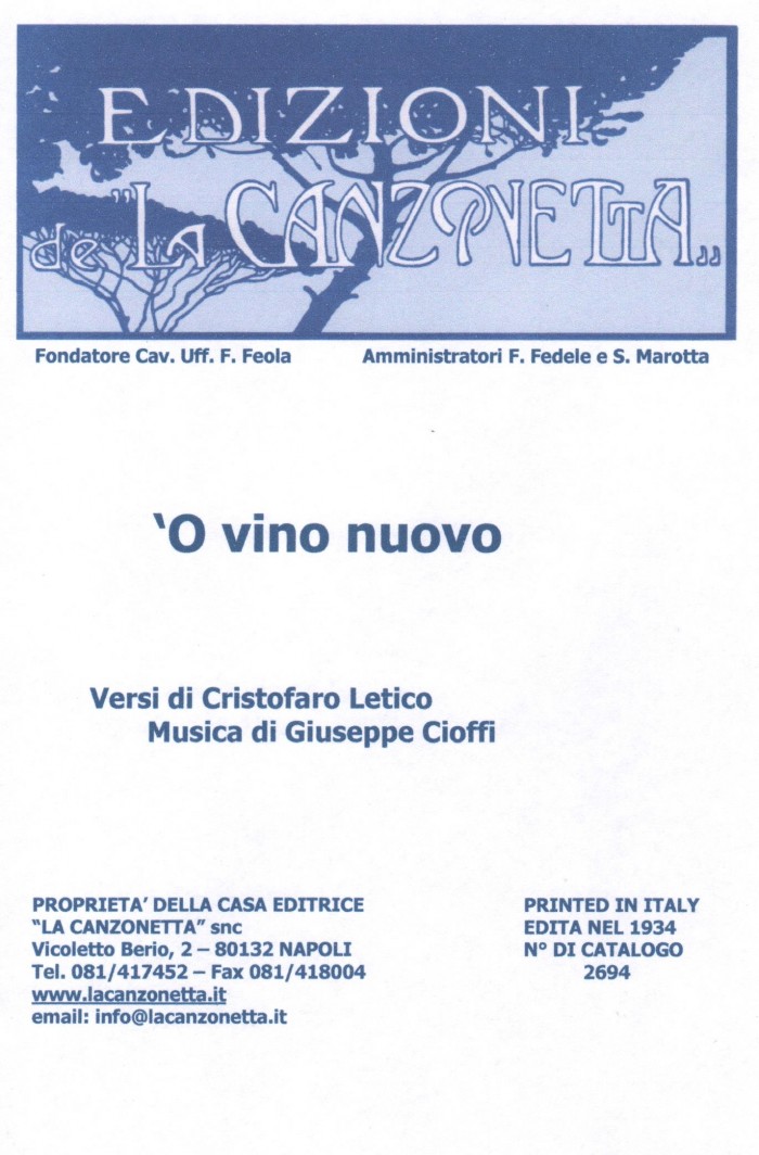 'O vino nuovo (Versi di Cristofaro Letico - Musica di Giuseppe Cioffi). Spartito musicale di Canto & Piano edito dalla casa editrice "La Canzonetta" nel 1934.