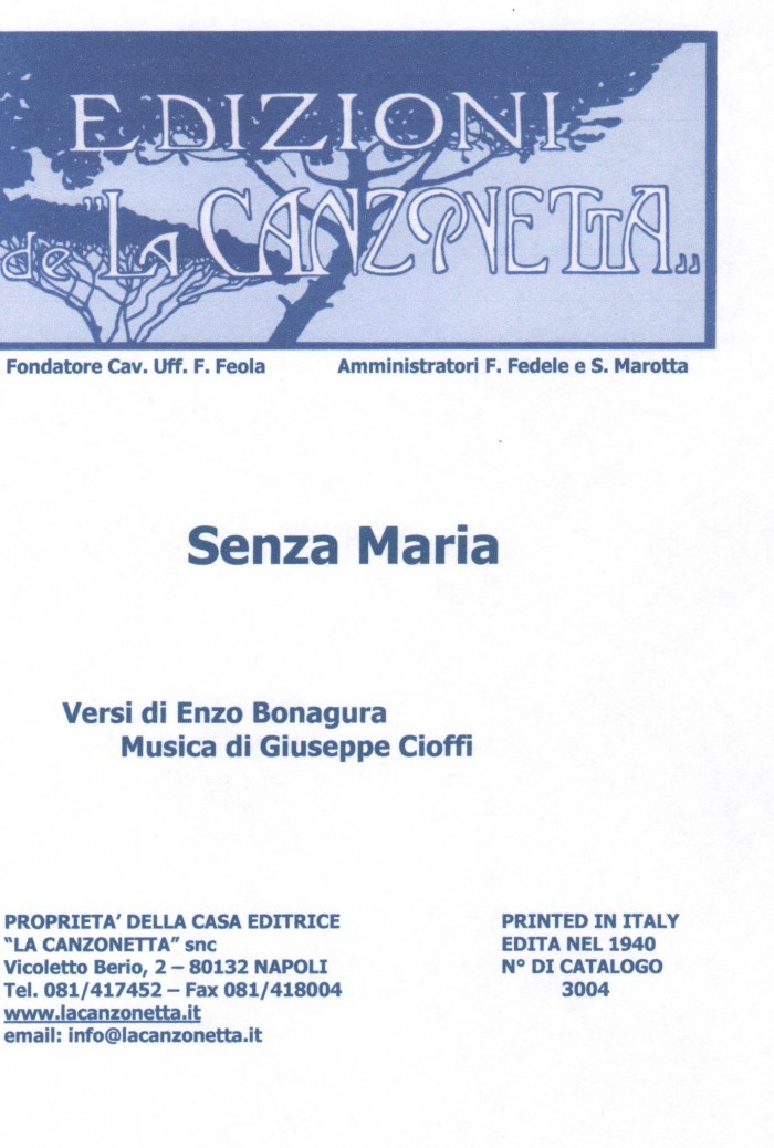 Senza Maria (Enzo Bonagura - Musica di Giuseppe Cioffi). Spartito musicale di Canto & Piano edito dalla casa editrice "La Canzonetta" nel 1940.