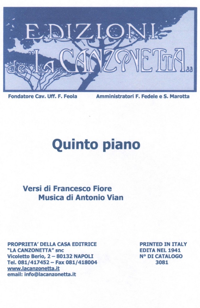 Quinto piano (Versi di Francesco Fiore - Musica di Antonio Vian). Spartito musicale di Canto & Piano edito dalla casa editrice "La Canzonetta" nel 1941.