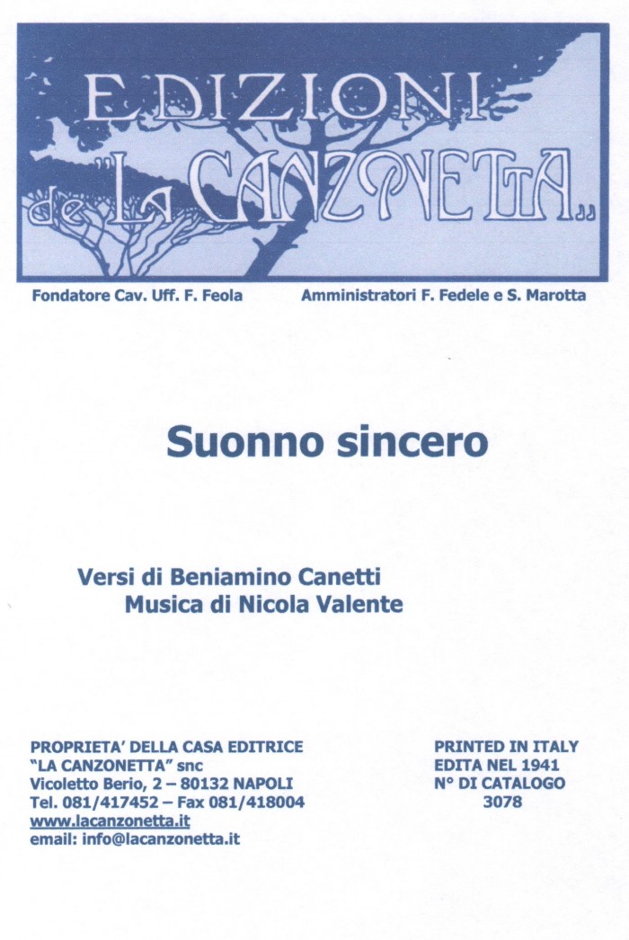 Suonno sincero (Versi di Beniamino Canetti - Musica di Nicola Valente). Spartito musicale di Canto & Piano edito dalla casa editrice "La Canzonetta" nel 1941.