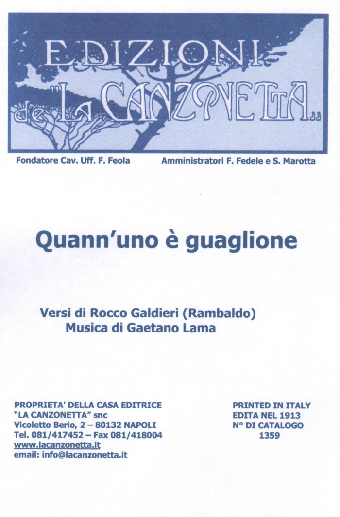 Quann'uno è guaglione (Versi di Rocco Galdieri (Rambaldo) - Musica di Gaetano Lama). Spartito musicale di Canto & Piano edito dalla casa editrice "La Canzonetta" nel 1913.