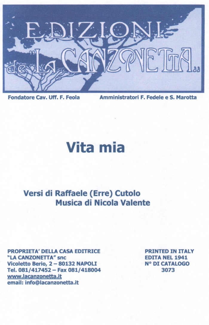 Vita mia (Versi di Raffaele Cutolo - Musica di Nicola Valente). Spartito musicale di Canto & Piano edito dalla casa editrice "La Canzonetta" nel 1941.
