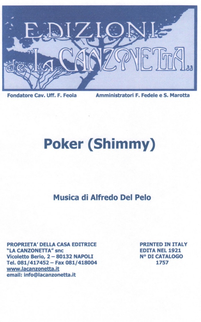 Poker - Shimmy (Musica di Alfredo Del Pelo). Spartito musicale di Canto & Piano edito dalla casa editrice "La Canzonetta" nel 1924.