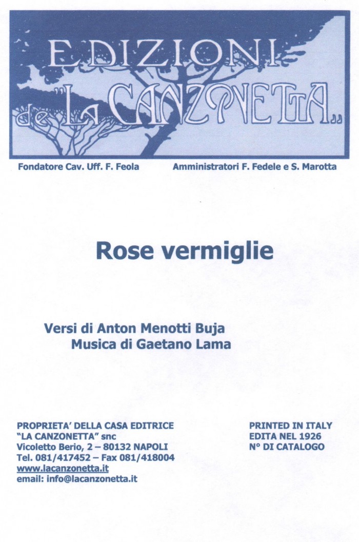 Rose vermiglie (Versi di Anton Menotti Buja - Musica di Gaetano Lama). Spartito musicale di Canto & Piano edito dalla casa editrice "La Canzonetta" nel 1926.
