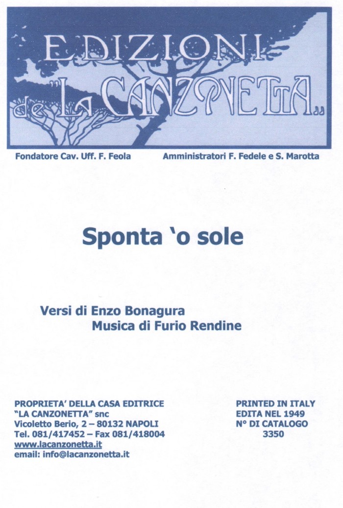 Sponta 'o sole (Versi di Enzo Bonagura - Musica di Furio Rendine). Spartito musicale di Canto & Piano edito dalla casa editrice "La Canzonetta" nel 1949.