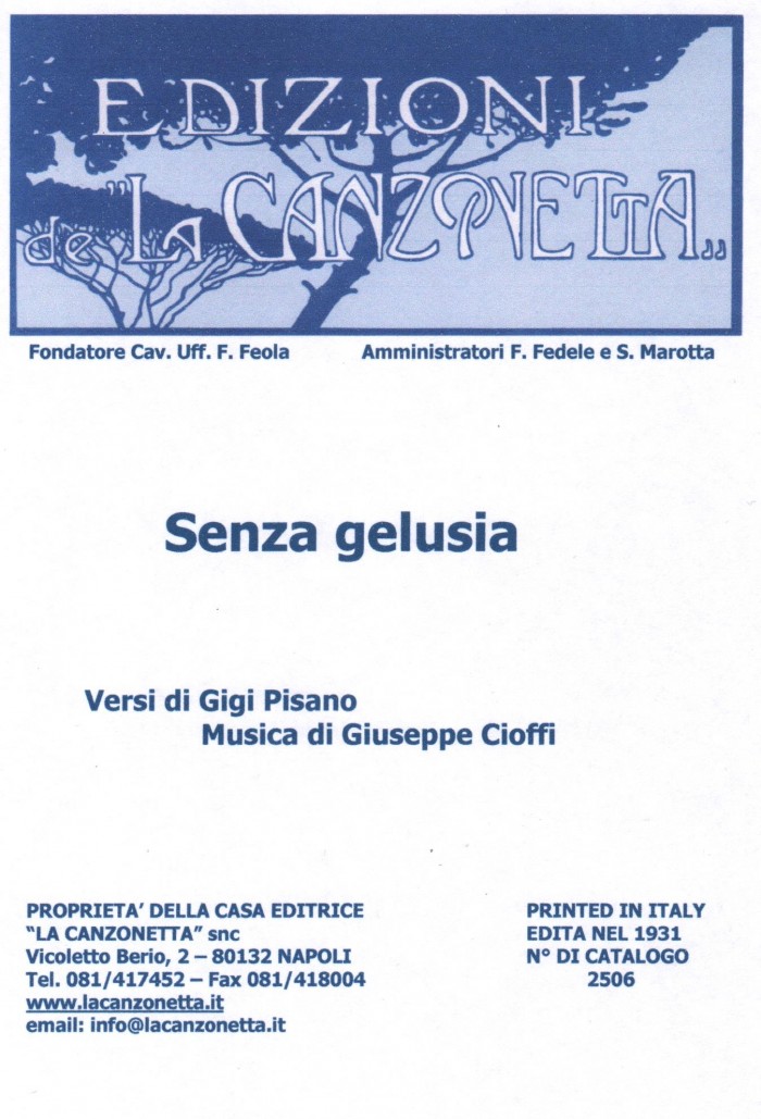 Senza gelusia (Versi di Gigi Pisano - Musica di Giuseppe Cioffi). Spartito musicale di Canto & Piano edito dalla casa editrice "La Canzonetta" nel 1931.