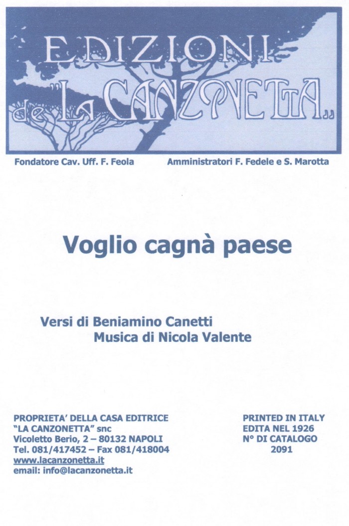 Voglio cagnà paese (Versi di Beniamino Canetti - Musica di Nicola Valente). Spartito musicale di Canto & Piano edito dalla casa editrice "La Canzonetta" nel 1926.