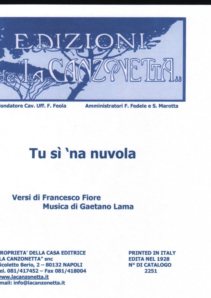 Tu sì 'na nuvola (Versi di Francesco Fiore - Musica di Gaetano Lama). Spartito musicale di Canto & Piano edito dalla casa editrice "La Canzonetta" nel 1928.