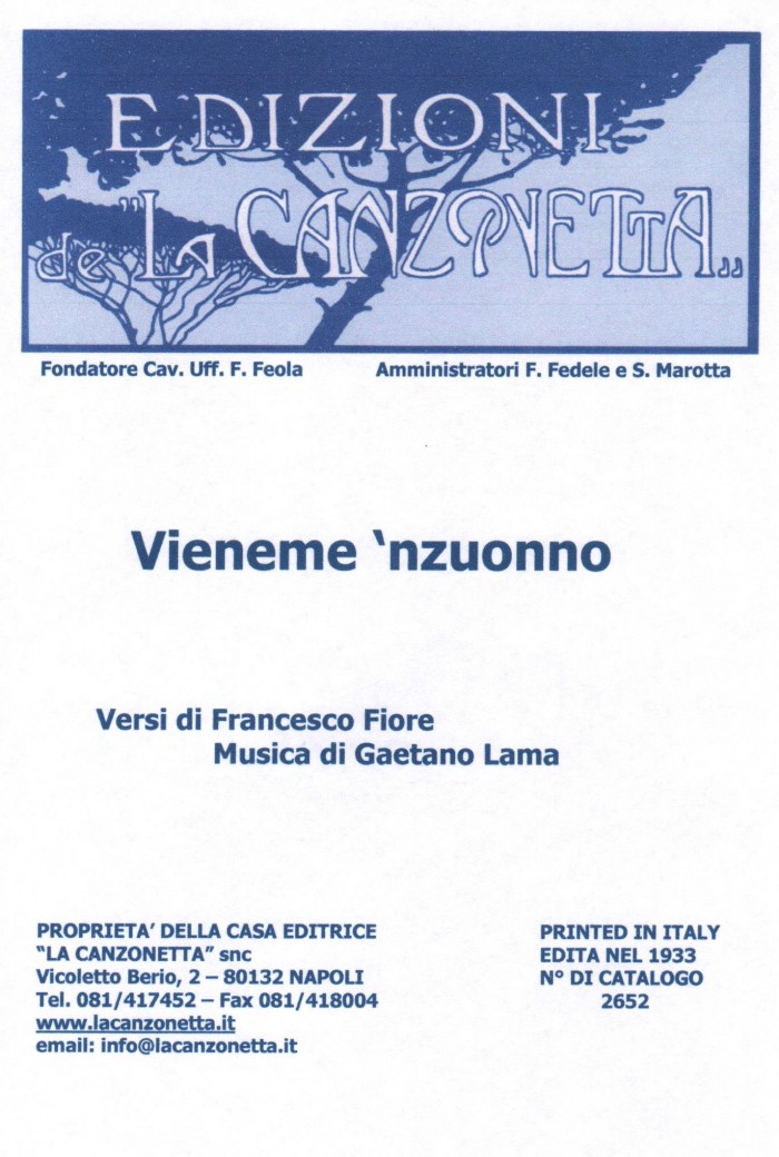 Vieneme 'nzuonno (Versi di Francesco Fiore - Musica di Gaetano Lama). Spartito musicale di Canto & Piano edito dalla casa editrice "La Canzonetta" nel 1933.