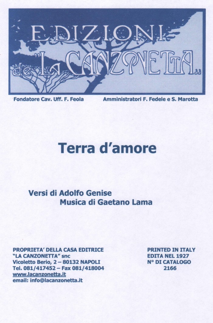 Terra d'amore (Versi di Adolfo Genise - Musica di Gaetano Lama). Spartito musicale di Canto & Piano edito dalla casa editrice "La Canzonetta" nel 1927.
