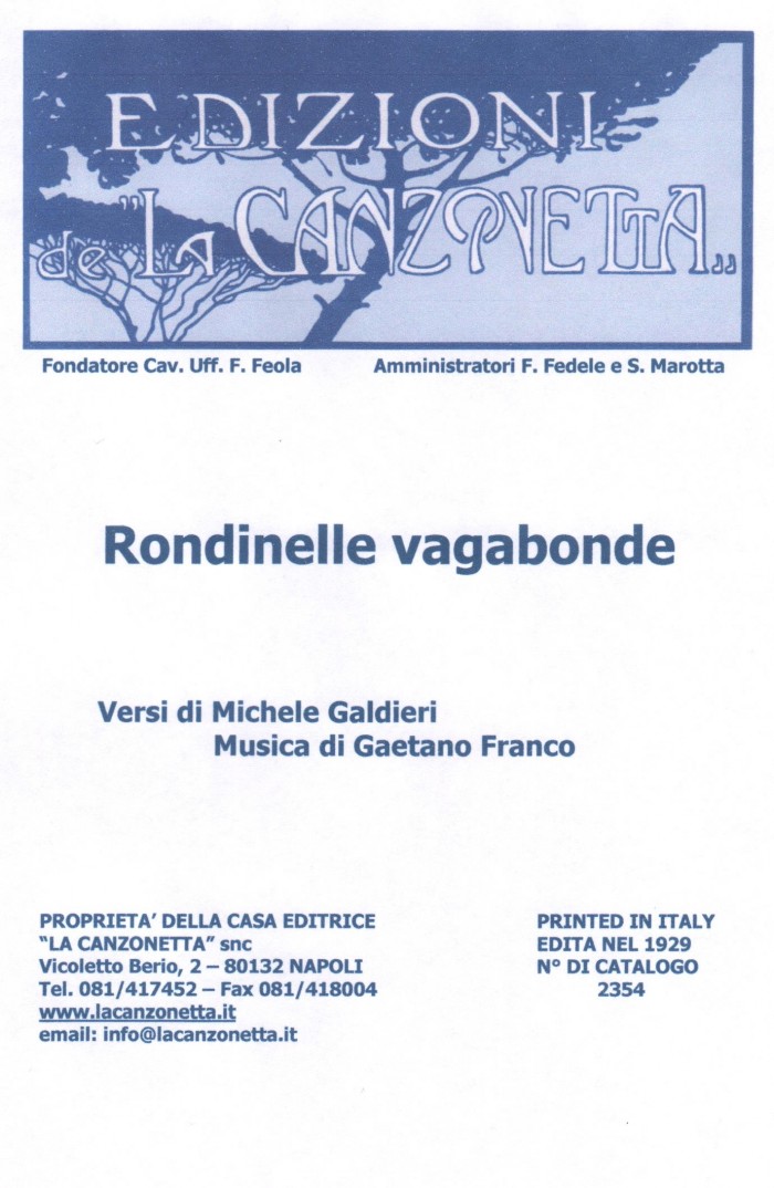 Rondinelle vagabonde (Versi di Michele Galdieri - Musica di Gaetano Franco). Spartito musicale di Canto & Piano edito dalla casa editrice "La Canzonetta" nel 1929.